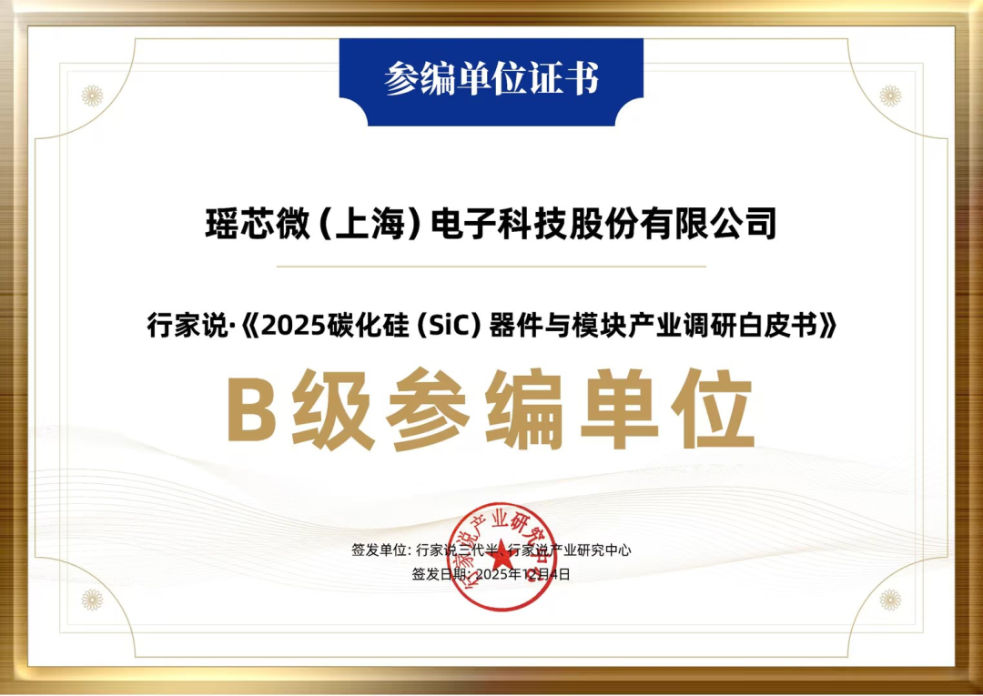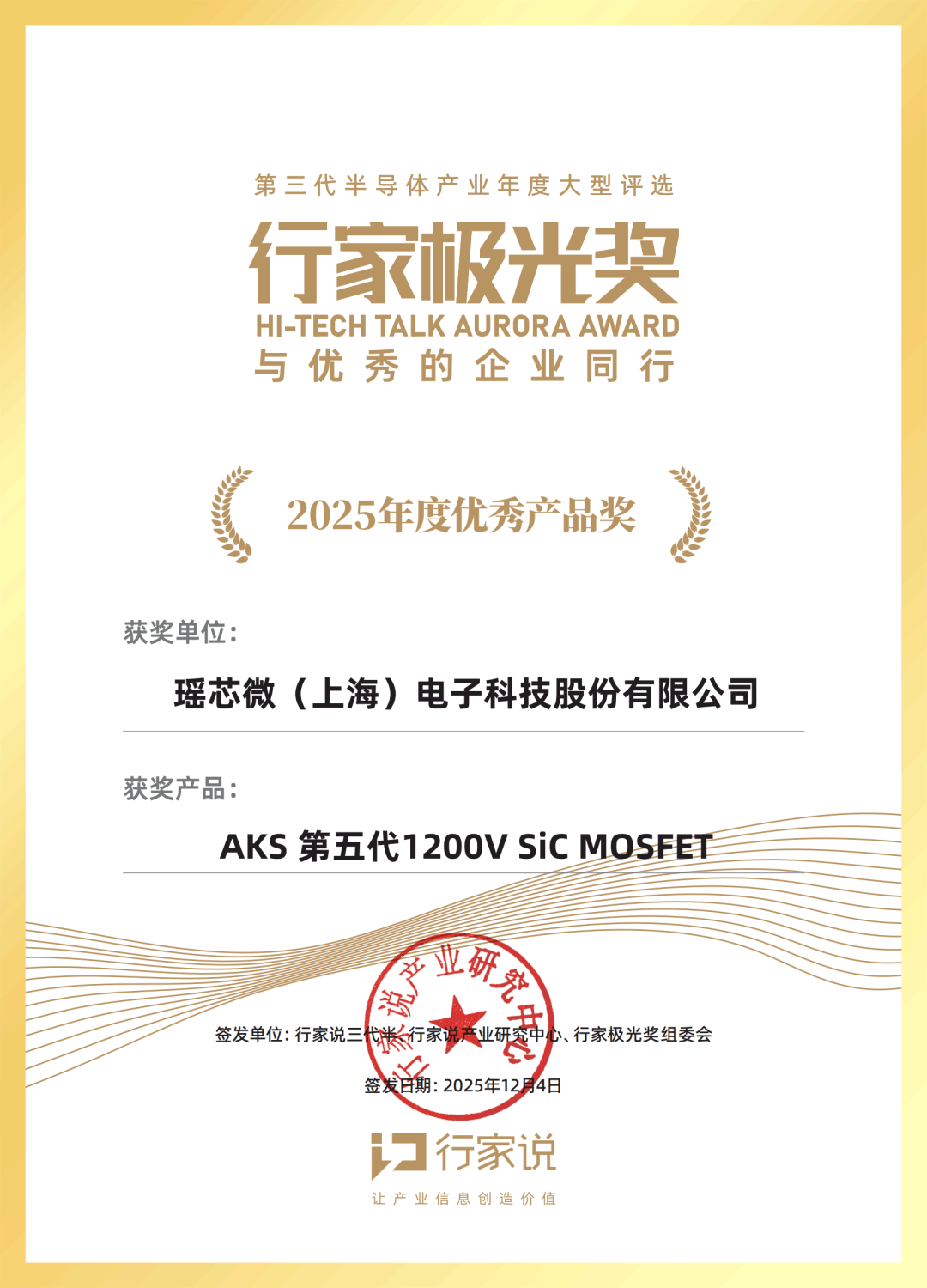 近日,行家说三代半年会“2025碳化硅&氮化镓产业高峰论坛暨极光奖颁奖典礼”圆满闭幕。 瑶芯凭借卓越的技术实力与突出的市场表现在行家极光奖颁奖典礼上成功斩获“中国SiC器件Fabless十强企业奖”及“SiC MOSFET年度优秀产品奖”,技术实力获行业权威认可。同时,由瑶芯作为参编单位,深度参与编写的《2025碳化硅(SiC)器件与模块产业调研白皮书》也在会上正式发布。
