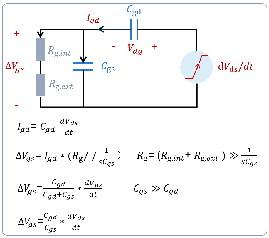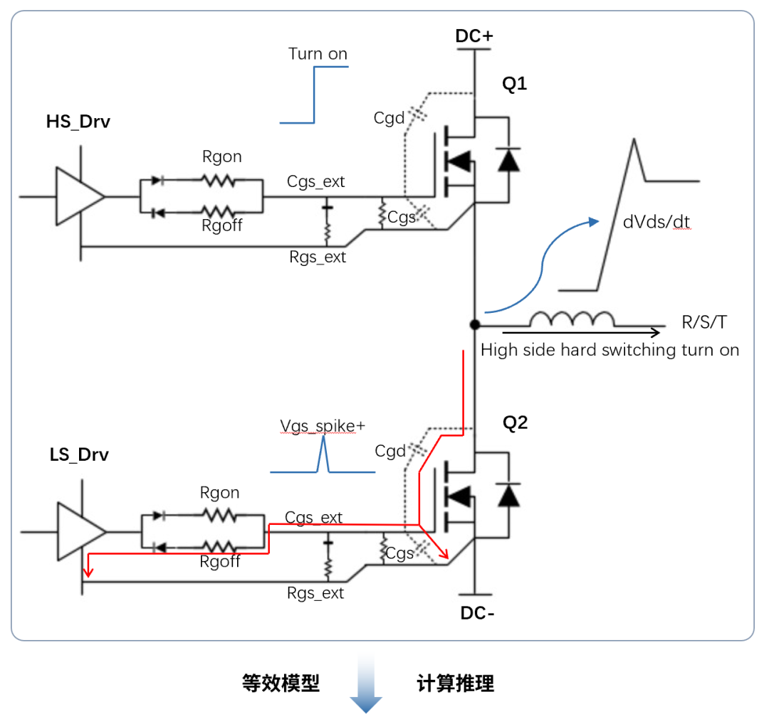 在电力电子领域,桥式电路是最常见的拓扑结构之一。如图1所示,当下管MOS关断时,桥臂中点电位急剧上升,产生的高速dv/dt会通过下管的米勒电容(Cgd)以及驱动电阻Rg在下管栅极产生正向串扰电压ΔVgs。一旦这个串扰电压超过器件阈值电压Vgs(th),就会导致下管二次导通,造成桥臂直通短路,瞬间损毁器件;同样原理,上管开通和关断也会在上管栅极分别造成正向和负向串扰。