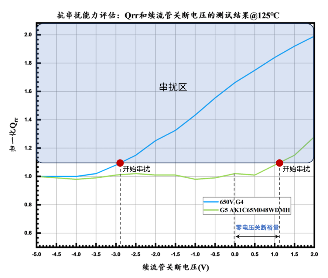 测试结果表明,瑶芯产品AK1C65M048WAMH在快速(Rgoff= 3.3Ω)关断、关断电压小于2V条件下,Qrr 变化极小,串扰效应几乎可忽略不计。意味着该产品在高温125℃,可满足零压关断,且有1V以上裕量。这得益于瑶芯在器件结构设计、栅极驱动优化和封装工艺上的持续创新,确保了器件在高频、高压、高温环境下的高可靠性与稳定性。