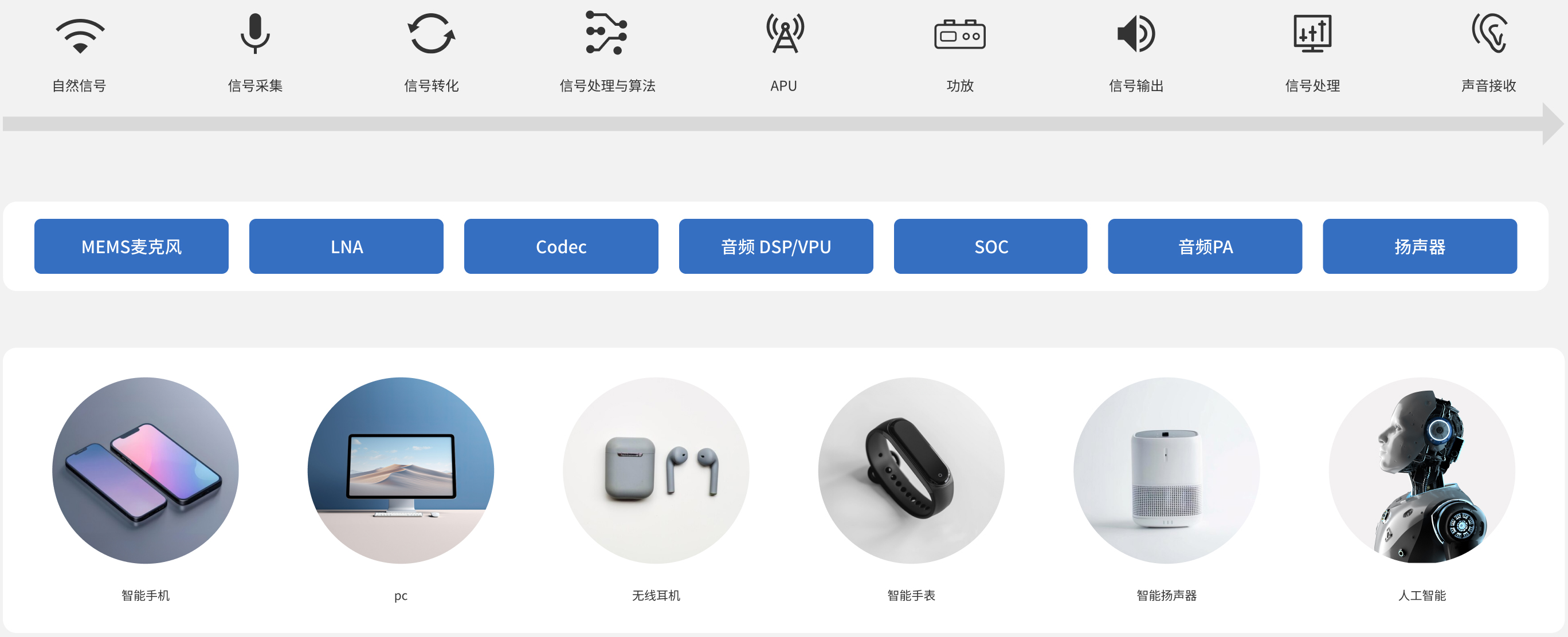 瑶芯以MEMS麦克风为抓手,构建了从信号采集(MEMS Sensor),信号转化(声信号转电信号),信号处理(放大/滤波等),音频算法(上行/下行),模数转换(ADC),数模转换(DAC),功放(PA)等音频信号链全过程的开发能力,提供高性能的音频信号链全链条解决方案。
